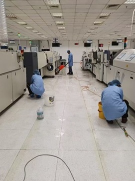 3100平方電子車間區(qū)域、辦公區(qū)域、倉庫區(qū)域防靜電地板清洗打蠟,有效防靜電處理,維護產(chǎn)品質(zhì)量。