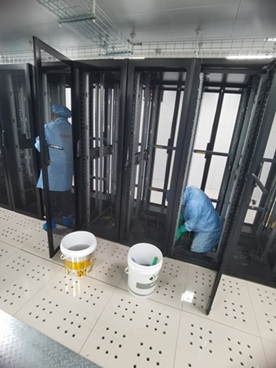 760平方通信公司數(shù)據(jù)機(jī)房深度清潔,清潔范圍:頂面,墻壁,地面,高架地板架空層,回風(fēng)通道,附屬設(shè)施,機(jī)柜表面。