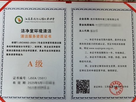 祝賀南京得得環(huán)境工程有限公司有限公司榮獲全國首批JSCA潔凈室環(huán)境清潔服務A級資質